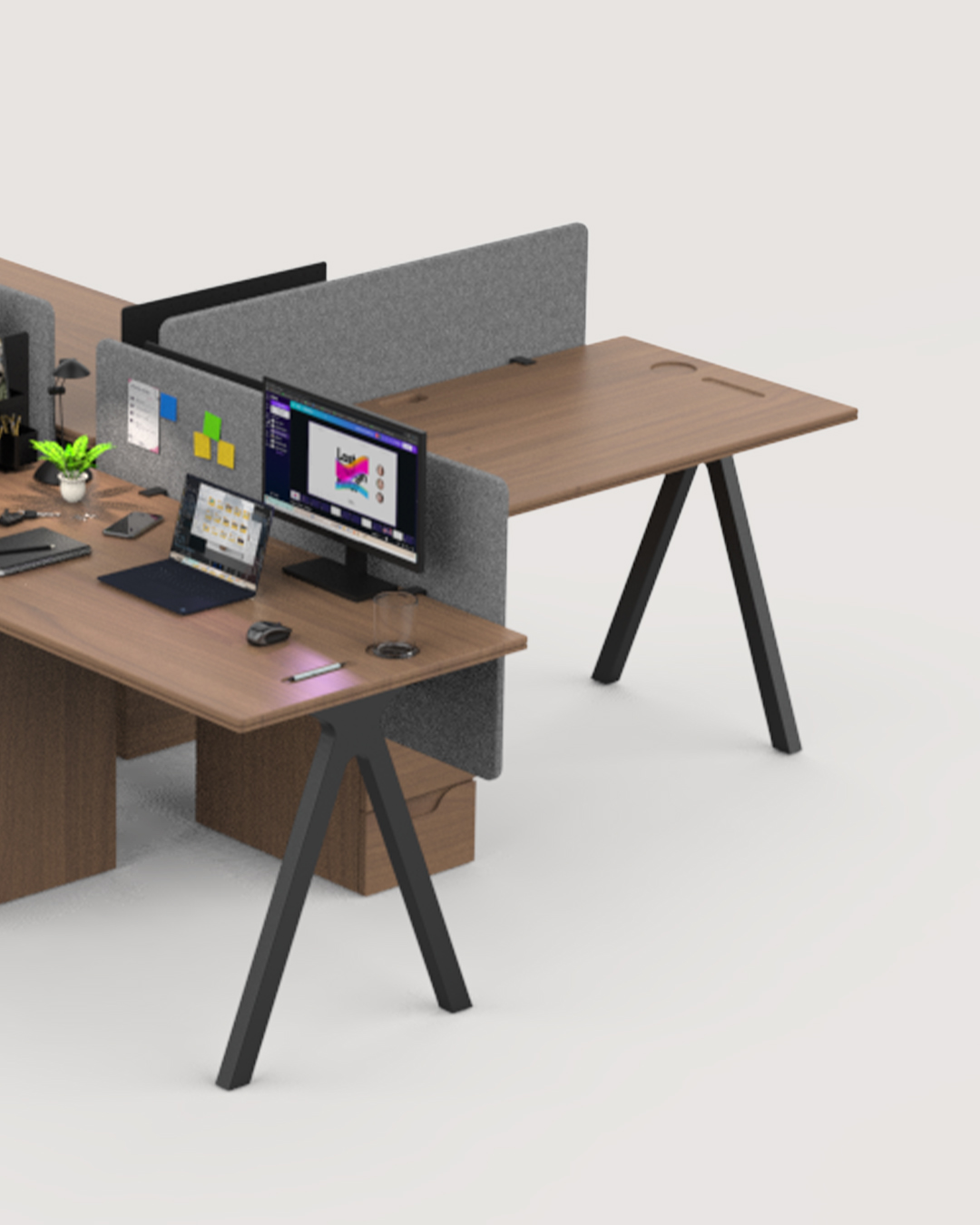 Créer un poste de travail modulable pour open space, conçu pour l’efficacité collective tout en préservant le confort individuel. Design sobre et professionnel : bois naturel, métal noir, panneaux acoustiques. Intègre rangements pratiques, séparations visuelles discrètes et surfaces optimisées pour ordinateur + tablette + documents.